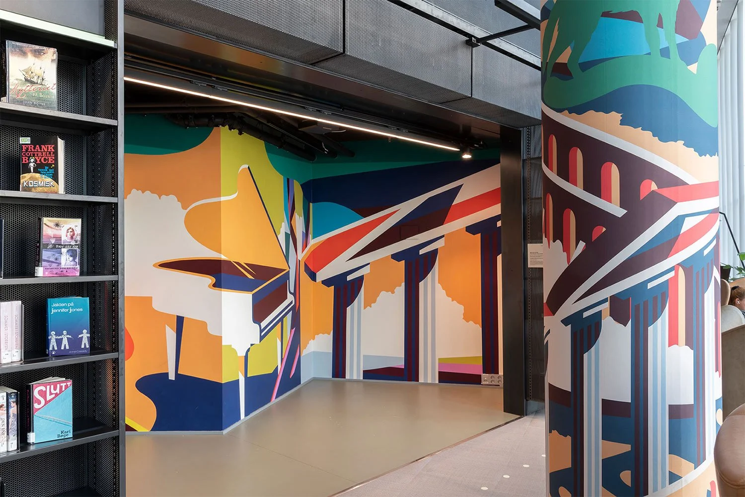 Murals at the main library in Oslo. Situated at the beginning of Barcode and just opposite the Opera house, this library new signature building is filled with art and design and of course books and references.