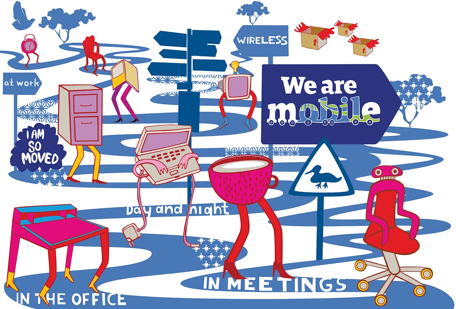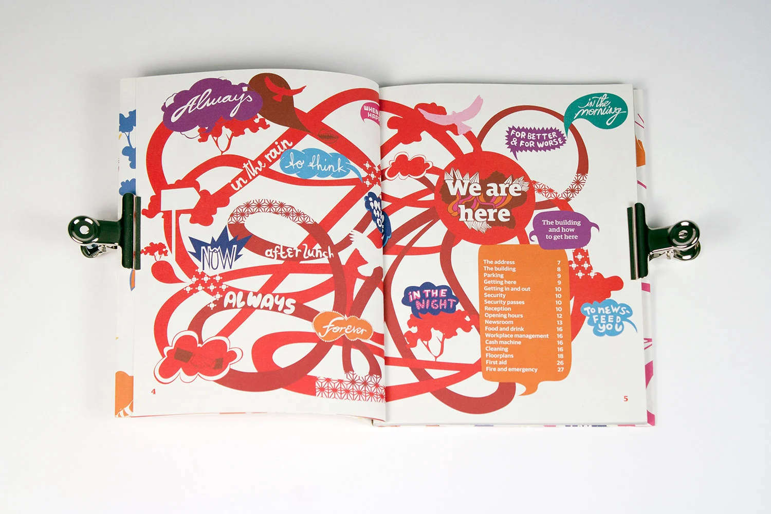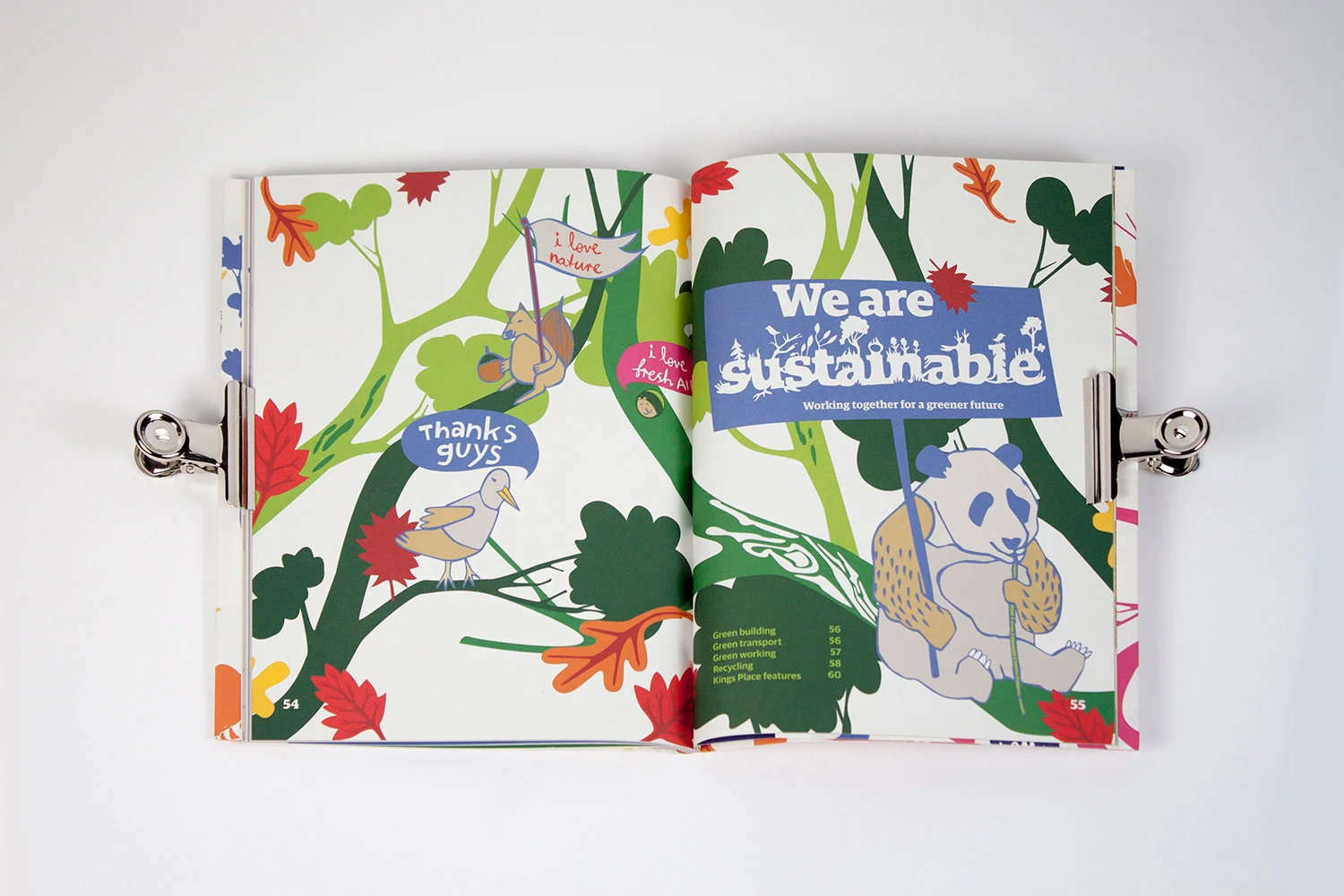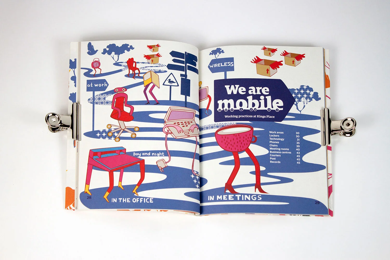 Illustrations for in-house handbook. Kings Place is the location of the new offices for the Guardian and the Observer. The Kings Place handbook contains all information for employees including how to find their way around the new building, learn new ways of working, a map, work ethics and practical things.