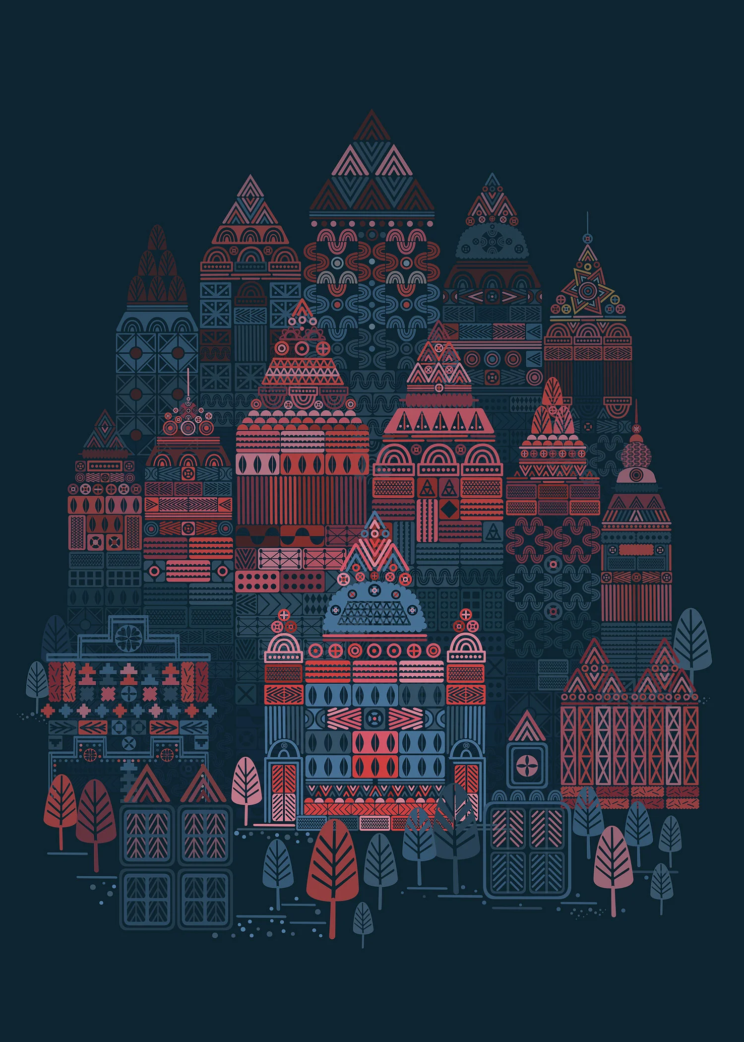 Utopian Night is a piece from the Utopian City series, built with geometric shapes and a complex color palette. By changing the color palette they bring out the seductive and mystical night.